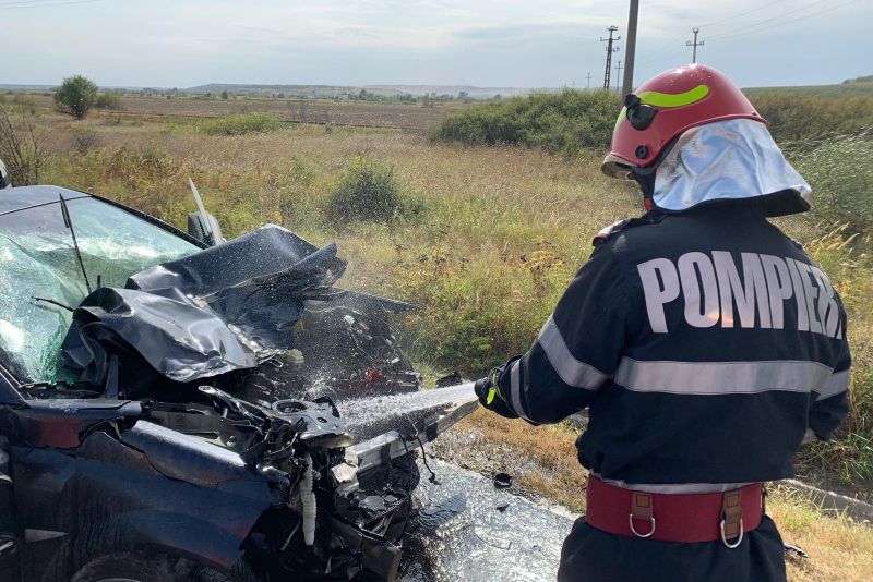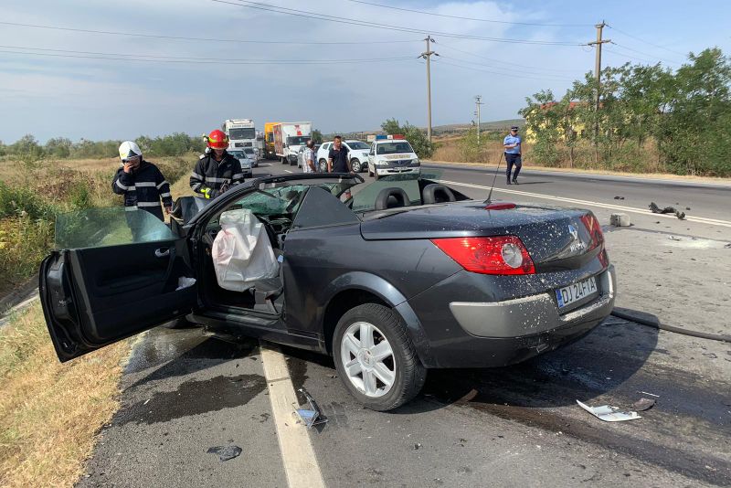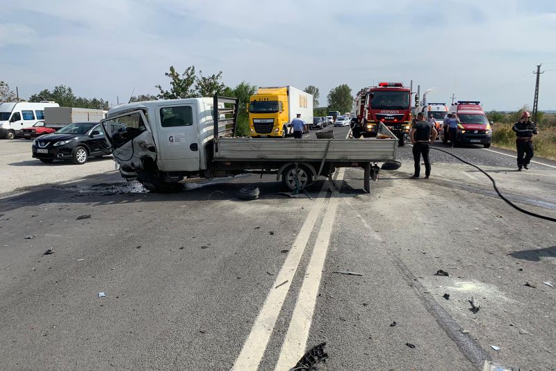 Accident cu trei victime, pe DN 6, în județul Dolj. Una dintre mașini a luat foc