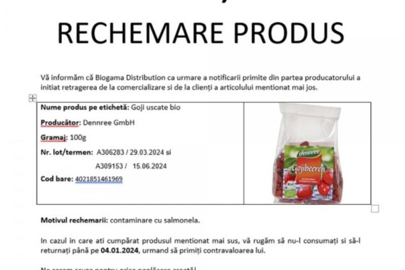 Potrivit ANSVSA, ca urmare a notificării primite din partea peoducătorului, Biogama Distribution a inițiat retragerea de la comercializare și de la clienți a produsului Goji uscate bio.