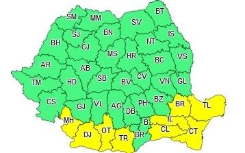 În Dobrogea și jumătatea de est a Munteniei instabilitatea atmosferică va fi temporar accentuată și se va manifesta prin averse torențiale, descărcări electrice, intensificări ale vântului (local rafale de 50...70 km/h) și izolat grindină. Cantitățile de apă vor fi de 20...25 l/mp și izolat 30...40 l/mp.