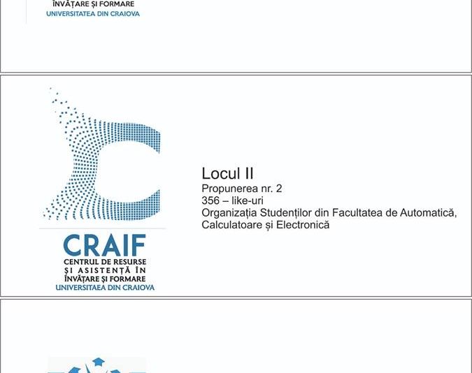 Potrivit reprezentanților Centrului de Resurse și Asistență în Învățare și Formare, în concurs au intrat 30 de logo-uri, cele trei propuneri câștigătoare fiind desemnate în urma voturilor primite pe pagina de Facebook a centrului.Cea mai apreciată s-a dovedit a fi propunerea tinerilor din cadrul Asociației Studenților Facultății de Științe Sociale, care a primit 714 „like-uri”. Locul al doilea, cu 356 de aprecieri este ocupat de propunerea Organizației Studenților din Facultatea de Automatică, Calculatoare și Electronică. Cea de-a treia poziție a clasamentului este ocupată de propunerea Asociației Studenților din Facultatea de Litere, cu 294 de aprecieri.„În urma contorizării voturilor primite pentru cele 30 de logo-uri, înscrise în concurs, avem trei propuneri câștigătoare. Apreciem implicareea tuturor și îi așteptăm și la următoarele inițiative/proiecte CRAIF”, au transmis reprezentanții Centrului.