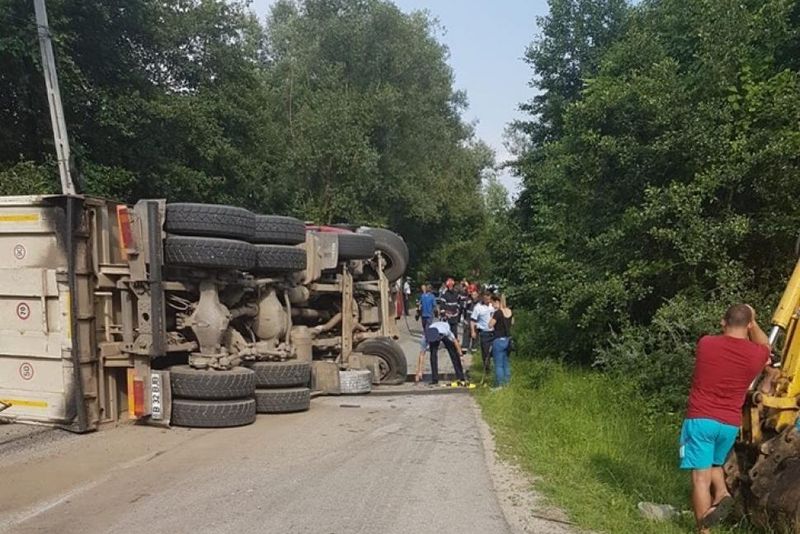 Camion încărcat cu bitum, răsturnat pe carosabil