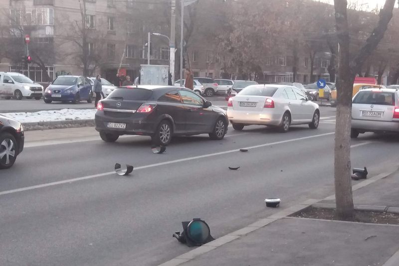 Un accident rutier, petrecut marți seara la intersecția străzilor Henri Coandă și Calea București din Craiova, a dus la distrugerea unui semafor.
