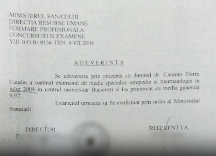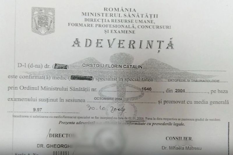 Un al doilea prezentat de Realitatea Plus arată faptul că medicul avea adeverință de medic specialist eliberată în ianuarie 2004, cu toate că a susținut examenul abia în iulie 2004.