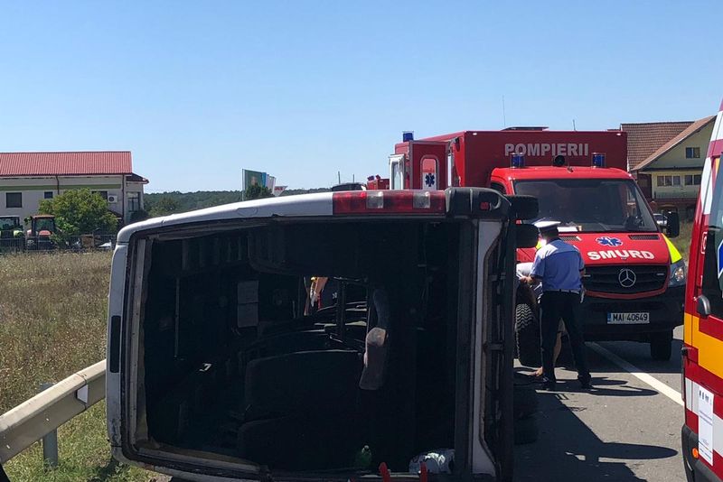 Două persoane au murit în accidentul de la Pieleşti. Explozia unei anvelope, cauza răsturnării microbuzului - FOTO