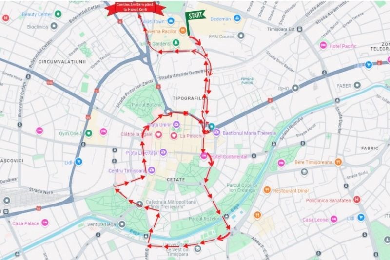 Punct de plecare din parcarea UBC 0 – Iulius Town Timisoara și deplasare pe traseul: B-dul ANTENEI -> Str. POPA ȘAPCĂ -> PUNCTELE CARDINALE -> Str. MARTIN LUTHER -> Str. PROCLAMAȚIA DE LA TIMIȘOARA -> Piata I.C. BRĂTIANU -> Str. MICHELANGELO -> B-dul VASILE PÂRVAN -> POD MIHAI VITEAZUL -> Str. 20 DECEMBRIE 1989 -> Bdul C.D.LOGA -> B-dul REGELE FERDINAND I -> B-dul REVOLUȚIEI DIN 1989 -> B-dul REGELE MIHAI I -> Str. GHE. DIMA -> PIAȚA MĂRĂȘTI -> Str. OITUZ -> PUNCTELE CARDINALE -> Str. POPA ȘAPCĂ -> B-dul ANTENEI -> PASAJ IULIUS TOWN -> CALEA ARADULUI -> DN 69 - Hanul KM 6