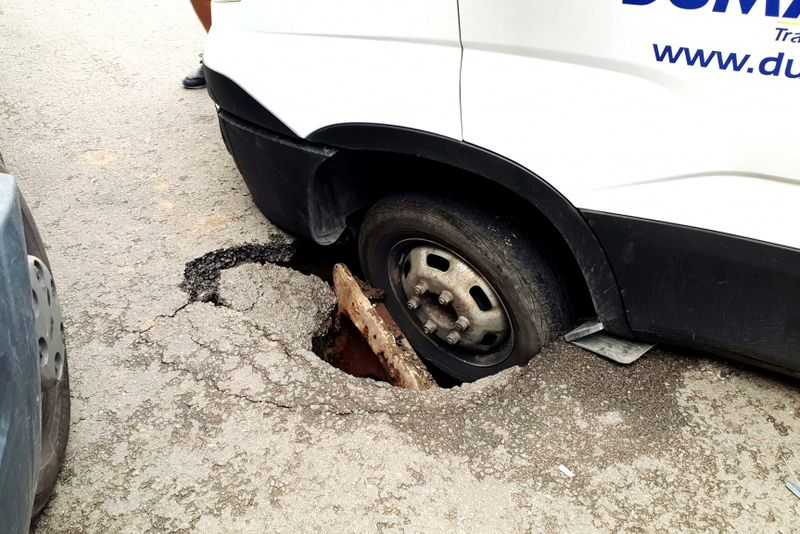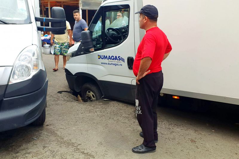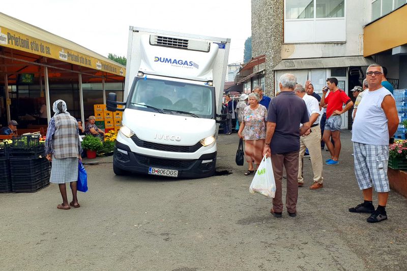 Imaginile cu o autoutilitară care a rămas blocată într-o gură de canal din Piaţa Centrală a Craiovei s-au viralizat pe Facebook, oamenii criticând infrastructura din zonă.