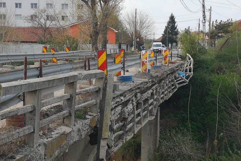 Pe acest pod aflat la kilometrul 11 al Drumului Național Craiova-Bechet se circulă cu restricții din august 2016. Lucrările au stagnat, spun autoritățile doljene, din cauza lipsei banilor, întârzierea bugetului aferent anului în curs complicând lucrurile.Zilnic, cozile de mașini se formează pe ambele sensuri de circulație, șoferii nevoiți să tranziteze această zonă menționând că iau tot timpul în calcul zecile de minute pierdut aici și pleacă mai devreme la drum.În ultima perioadă, spun cei care trec zilnic pe acest pod, bucăți de beton au început să cadă în lateral, o parte dintre acestea rămânând în aer. Oamenii se tem că siguranța le este pusă în pericol și acuză faptul că nimeni nu pare a fi interesat de finalizarea acestor lucrări.Directorul Direcției Regionale de Drumuri și Poduri Craiova, Alin Golumbeanu, a menționat că lucrarea face parte din contractul care privește reabilitarea DN 55 Craiova-Bechet și că firmei de construcții i s-a dat ordin de începere a lucrărilor, cu data de 8 aprilie. Teoretic, spune Golumbeanu, săptămâna viitoare ar trebui ca muncitorii să fie prezenți pe șantier.„Au fost câteva aspecte de rezolvat. Anul trecut, nu au fost bani pentru acest pod, acum bani sunt. Nu doar acest pod trebuie consolidat, ci sunt cinci. Noi am dat ordin de începere a lucrărilor, cu 8 aprilie. Am alocat 11 milioane de lei firmei de construcții și nu cred că vor mai fi probleme. S-a întârziat și la noi din cauza bugetului. 73% din lucrările prevăzute în acest contract au fost finalizate. Pentru această diferență, de 27 de procente, trebuie să plătim constructorului 19 milioane de lei. Noi deja am alocat 11 milioane, deci nu văd de ce nu ar începe lucrările. Durează câteva zile cu actele, așa că într-o săptămână ar trebui să îi vedem pe șantier. Noi le-am scris toate aceste aspecte și chiar am stabilit și o întâlnire cu dumnealor, săptămâna viitoare. Este adevărat, oamenii au dreptate, dar nu depinde totul numai de noi”, a declarat Golumbeanu.Cât privește siguranța participanților la trafic despre care vorbesc șoferii, constructorul este cel care trebuie să asigure elementele necesare pentru a se circula fără riscuri.„Amplasamentul este predat constructorului. Firma are această obligație, legat de siguranța circulației în zonă. Ea este răspunzătoare. Noi știm că au fost luate măsurile ce se impun. Sunt elemente montate pentru siguranța rutieră, adică semanlizare verticală, orizontală. Sunt și semafoare. Nu cred că există vreun pericol, mai ales dacă se respectă și limitele de viteză”, a conchis directorul DRDP Craiova.Referitor la podețul situat la intrare în comuna Bratovoești, prins tot în acest mare contract, și aici au stagnat lucrările, situația depinzând acum doar de constructor.De menționat că firma SECOL, cea care se ocupă de reabilitarea DN 55, a fost amendată în repetate rânduri de către polițiștii din cadrul Biroului Drumuri Naționale și Europene din cauza semnalizării necorespunzătoare a lucrărilor și lipsei marcajelor rutiere.Sursa Foto: Facebook Craiova Cetatea Banilor Las Vegasul Romaniei.
