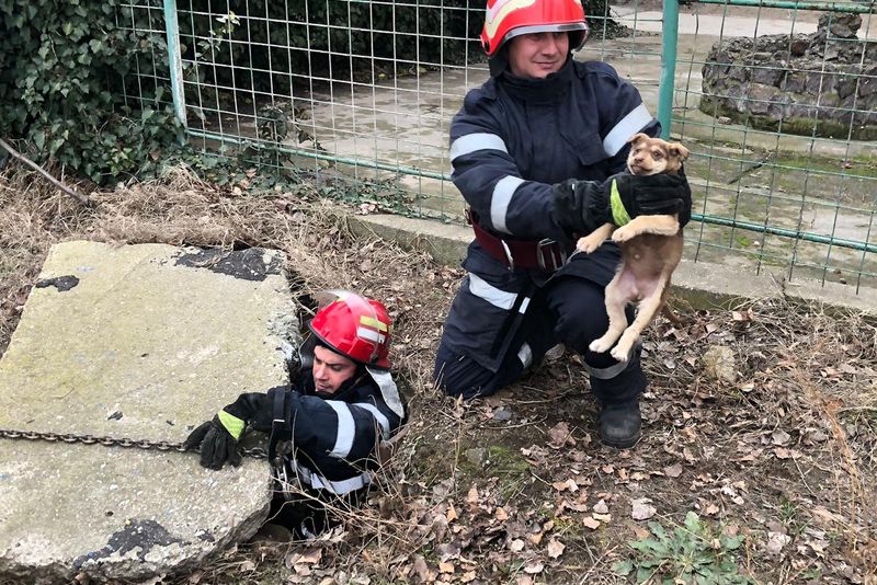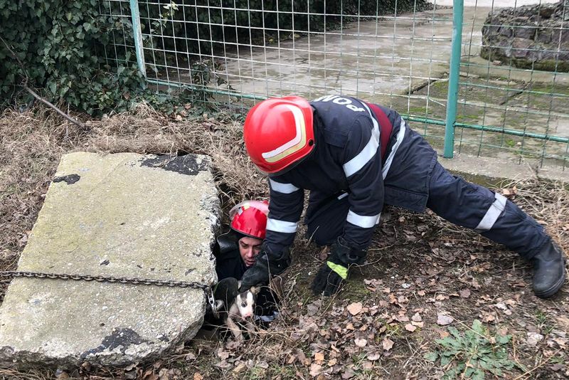 ÎNDUIOŞĂTOR. Căţeluş căzut într-un canal, salvat de pompierii din Calafat - FOTO
