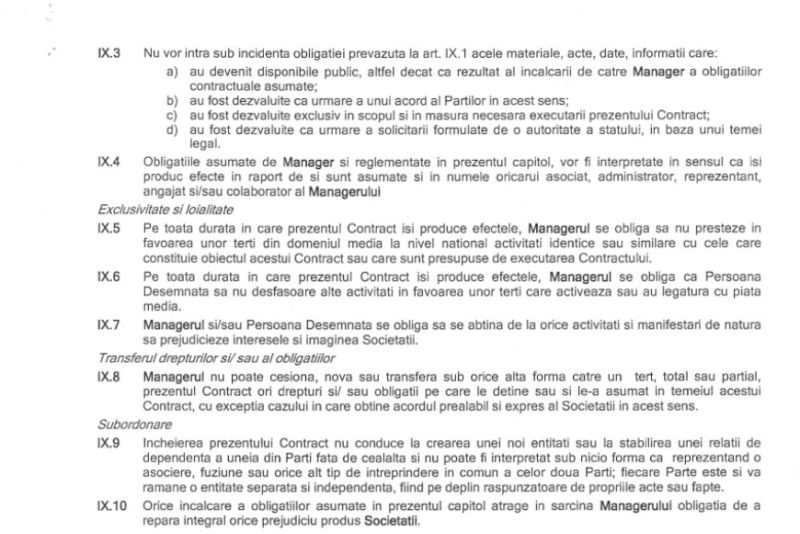 Sebastian Ghiță, în calitate de manager, s-a angajat să păstreze confidențialitatea și să nu întreprindă nicio acțiune care să producă efecte negative asupra REALITATEA MEDIA SA. De asemenea, contractul semnat de afacerist nu trebuia să conducă la crearea unei noi entități sau la stabilirea unei relații de dependență a uneia dintre părți față de cealaltă.