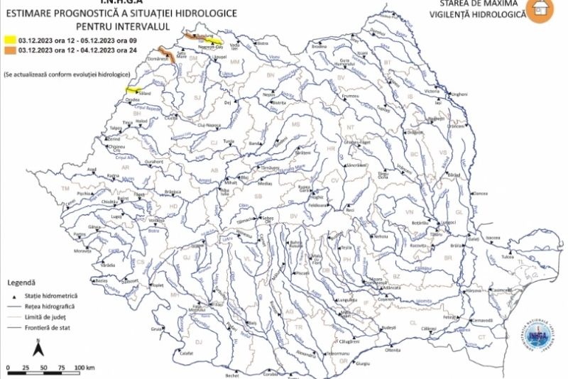 În intervalul 3 decembrie, ora 12:00 - 5 decembrie, ora 09:00, a intrat în vigoare o atenţionare Cod galben de viituri, pe râurile din bazinele hidrografice: Tur (judeţul Satu Mare), Crasna - pe sector aval S.H. Craidorolt (judeţul Satu Mare) şi Barcău - curs inferior (judeţul Bihor).