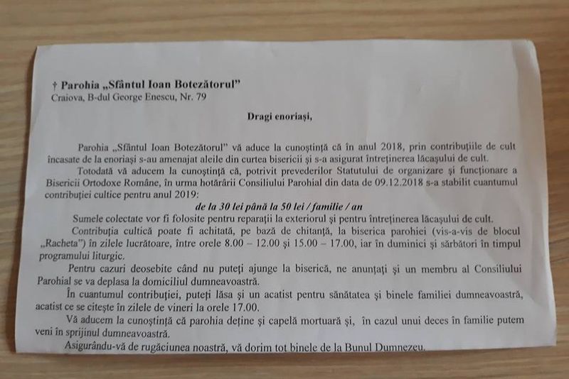 Astfel, craiovenii care aparţin de această parohie au primit, cu ocazia sărbătorilor de iarnă, atunci când preoții merg cu Crăciunul, cum se spune în popor, aceste înștiințări.Cei mai mulți dintre enoriași consideră că procedând astfel, reprezentanții bisericii respective devin agenți de marketing.„De vreo șapte sau opt ani tot primim acești fluturași. Ne sunt dați când vin cu Crăciunul, să aflăm despre contribuție. Nici nu intră bine în casă că și scot acea hârtie. Dacă dau bani că vreau este una, dacă îmi tot amintești că ar cam trebui să dau este alta. Totul se rezumă la bani în cazul preoților de azi. Bani pentru acatist, bani pentru pomeniri, pentru nunți, botezuri și înmormântări”, a spus unul dintre locatarii blocului 15 din Craiovița Nouă.De partea cealaltă, preotul consideră că aceste informări nu ar trebui să deranjeze pe nimeni, fiind o simplă modalitate de a le comunica oamenilor faptul că și ei pot ajuta financiar biserica. Mai mult, acesta a dat asigurări că nimeni nu își permite să condiționeze serviciile religioase pentru neplata acestor contribuții de cult.Contribuția cultică pentru anul 2019 a fost stabilită în cadrul Consiliului Parohial, la sfârșitul anului trecut, suma anuală pe care o familie o poate achita fiind de la 30 de lei până la 50 de lei.Ca în fiecare an, pentru a deveni convingători, reprezentanții parohiei vin și cu un serviciu promoțional: „În cuantumul contribuţiei, puteți lăsa şi un acatist pentru sănătatea şi binele familiei, acatist ce se citește în zilele de vineri la orele 17.00”.Tot din înştiinţările tipărite, craiovenii vizaţi află care este programul casieriei, care sunt obiectivele parohiei pentru acest an, dar şi „beneficiile” pe care le vor avea dacă vor sprijini demersurile bisericeşti.Anul trecut, cu banii încasați de la enoriași, au fost amenajate alei în curtea lăcașului de cult și s-a asigurat întreținerea imobilului, se arată în înștiințarea oferită enoriașilor.Parohiei „Sfântul Ioan Botezătorul” din Craiova îi sunt arondate peste 2.000 de familii, dar dintre acestea doar 4% sau 5 % oferă sprijin bănesc bisericii, după cum susțin reprezentanții parohiei în cauză.De menționat că această biserică funcționează pe un teren unde se contruiește, de aproximativ 12 ani, o catedrală cu bani de la bugetul oraşului, al judeţului Dolj, dar şi al enoriaşilor. Construcţia respectivă a înghiţit până acum peste două milioane lei, numai de la Consiliul Judeţean Dolj şi este departe de a fi finalizată.În primă fază, construcțiile au demarat în 1990, au fost abandonate din lipsă de fonduri, fiind reluate în 2006. Consiliul Județean Dolj a alocat bani, pentru construirea Catedralei Ortodoxe Sfântul „Ioan Botezătorul”, în baza unui protocol de cooperare încheiat în anul 2007 cu Mitropolia Olteniei. Această catedrală ar fi trebuit să fie gata în anul 2016, șantierul fiind în plină derulare și la ora actuală.[caption id="attachment_86741" align="alignnone" width="300"]