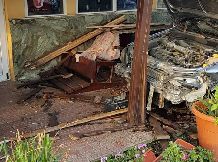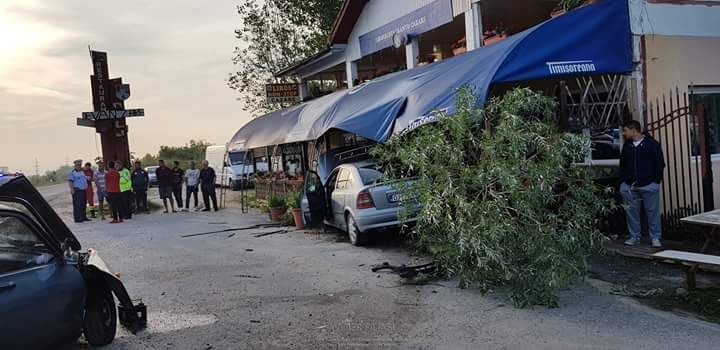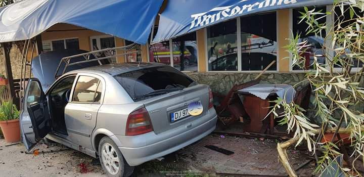 FOTO. Trei persoane rănite într-un accident produs la intrare în Filiași. O mașină a fost proiectată într-o terasă