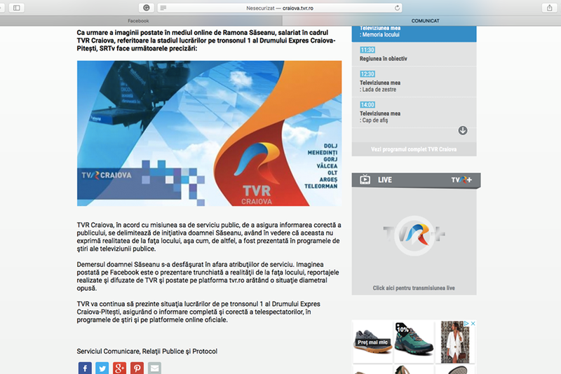 TVR Craiova a prezentat, pompos, momentul: ,,Veste bună pentru olteni și nu numai! Astăzi au început lucrările pe două dintre cele patru tronsoane ale drumului #expres #Craiova-Piteşti. La eveniment au participat Liviu Dragnea, preşedintele Camerei Deputaţilor, #LiaOlguţaVasilescu, secretar al Camerei Deputaţilor şi #ClaudiuManda, vicepreședinte al Senatului României. Mai multe aflați din materialul realizat de colegii noștri, Andrei Marinaș și Cristi Roșu”.Asta în condițiile în care pentru acel drum nu există nicio autorizație de la nicio instituție. De altfel, după terminarea simulacrului de inaugurare a drumului expres Craiova- Pitești a dispărut butaforia.Ramona Săseanu, jurnalist TVR Craiova, a publicat a doua zi, pe pagina personală de Facebook, o fotografie cu locul unde se desfășurase așa-zisa inaugurare. Se putea observa cu usurință din fotografie că disparuseră toate utilajele, iar locul rămăsese pustiu.Deși postarea a fost facută pe o pagină personală, TVR Craiova a transmis un comunicat de presă prin care practic s-a dezis de propriul salariat.,,Ca urmare a imaginii postate în mediul online de Ramona Săseanu, salariat în cadrul TVR Craiova, referitoare la stadiul lucrărilor pe tronsonul 1 al Drumului Expres Craiova-Pitești, SRTv face următoarele precizări:TVR Craiova, în acord cu misiunea sa de serviciu public, de a asigura informarea corectă a publicului, se delimitează de iniţiativa doamnei Săseanu, având în vedere că aceasta nu exprimă realitatea de la faţa locului, aşa cum, de altfel, a fost prezentată în programele de ştiri ale televiziunii publice.Demersul doamnei Săseanu s-a desfăşurat în afara atribuţiilor de serviciu. Imaginea postată pe Facebook este o prezentare trunchiată a realităţii de la faţa locului, reportajele realizate şi difuzate de TVR şi postate pe platforma tvr.ro arătând o situaţie diametral opusă.TVR va continua să prezinte situaţia lucrărilor de pe tronsonul 1 al Drumului Expres Craiova-Pitești, asigurând o informare completă şi corectă a telespectatorilor, în programele de ştiri şi pe platformele online oficiale”, a transmis TVR Craiova.Mai mult, soțul directoarei TVR Craiova a rostogolit pe propria pagina de Facebook comunicatul transmis de instituția publică.După publicarea acestui comunicat, pagina de Facebook TVR Craiova a devenit festival de înjurături, reproșuri și acuzații din partea publicului.