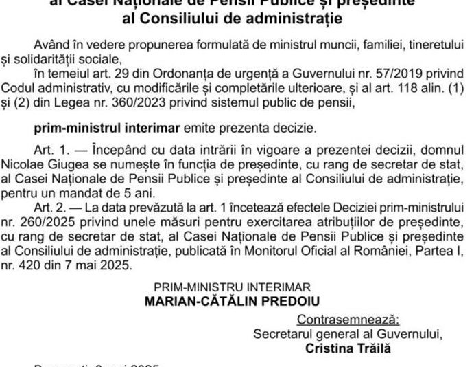 S-a schimbat directorul la Casa Națională de Pensii! Un craiovean a plecat pentru a-i face loc unui alt craiovean. Conform unei decizii a premierului interimar Cătălin Predoiu, publicată joi în Monitorul Oficial, Nicolae Giugea, fost deputat PNL de Dolj în perioada 2016 – 2024, a fost numit în funcția de președinte, cu rang de secretar de stat, al Casei Naționale de Pensii Publice (CNPP).
