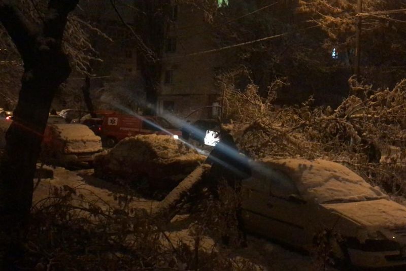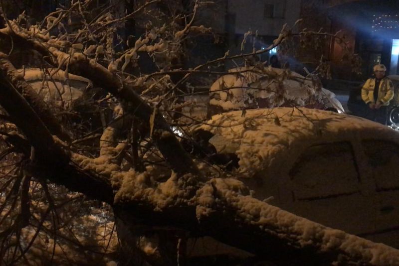 Un copac a căzut, duminică seara, peste două autoturisme parcate pe o stradă, în Craiova, din cauza zăpezii.