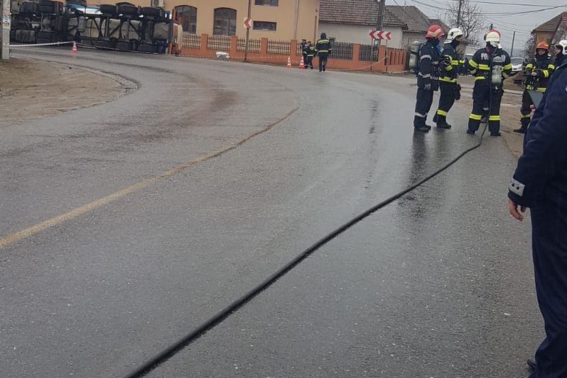 O cisternă încărcată cu sodă caustică s-a răsturnat în șanț, miercuri după-amiaza, într-o comună din județul Dolj, un echipaj CBRN intervenind în acest caz întrucât au fost depistate scurgeri pe la vană.