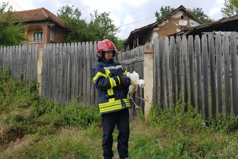 VIDEO/FOTO. Operațiune inedită a pompierilor doljeni. Au salvat un pui de barză care căzuze din cuib