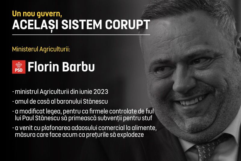 „Florin Barbu rămâne la Ministerul Agriculturii. El este omul de casă al familiei Stănescu. De altfel, acesta a modificat legea, astfel încât firmele fiului lui Paul Stănescu să obțină subvenții pentru stuf“, a mai transmis AUR.