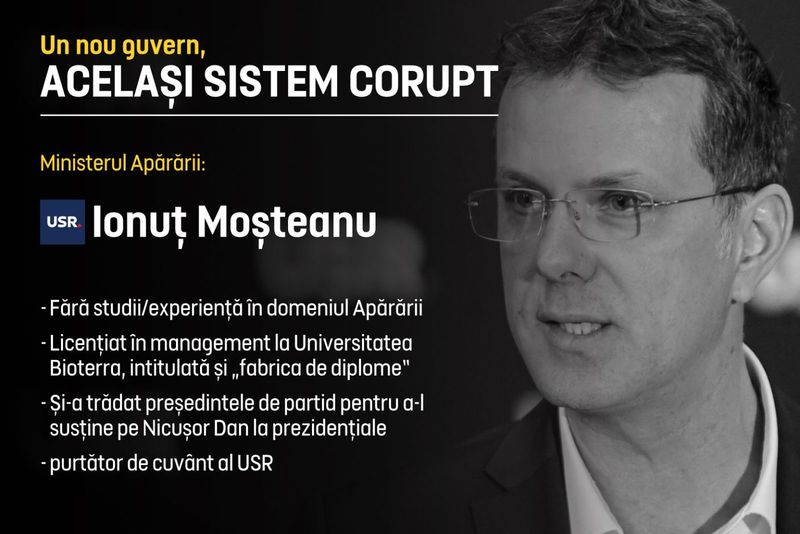 Pe Ionuț Moșteanu (USR), actualul ministru al Apărării, îl recomandă funcția de purtător de cuvânt al USR. Nu are studii sau experiență în domeniul Apărării, fiind licențiat în management la Universitatea Bioterra, celebră pentru fabricarea de diplome. Moșteanu și-a trădat președintele de partid pentru a-l susține pe Nicușor Dan, iar acum este recompensat cu această funcție, primind și portofoliul de vicepremier.