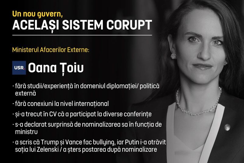 Oana Țoiu (USR), noul ministru de Externe, nu are nicio legătură cu domeniul diplomației, având studii în jurnalism. Au bogat frica în români că dacă ajungem la putere, atunci România va fi izolată la nivel internațional, dar actuala ministră de Externe a scris pe X că Trump și Vance fac bullying, iar Putin i-a otrăvit soția lui Zelenski. Ea este trimisă acum să reprezinte România și să negocieze la nivel internațional pentru interesele țării noastre.