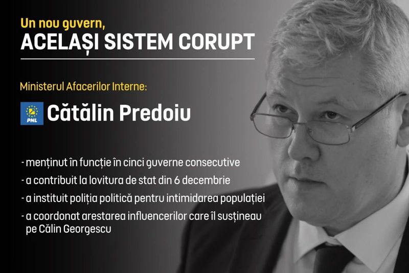 „Unul dintre ei este Cătălin Predoiu- ministrul de Interne care a contribuit activ și la lovitura de stat din 6 decembrie. Ministrul care a încercat intimidarea populației, prin arestarea și reducerea la tăcere a influencerilor care și-au exprimat susținerea pentru schimbare în spațiul public. Unul dintre influenceri este Bogdan Peșchir, deținut politic, umilit în fața jurnaliștilor de către polițiștii controlați de Predoiu, puși să facă poliție politică, în timp ce combaterea drogurilor și a infracționalității au fost abandonate“, susține AUR.