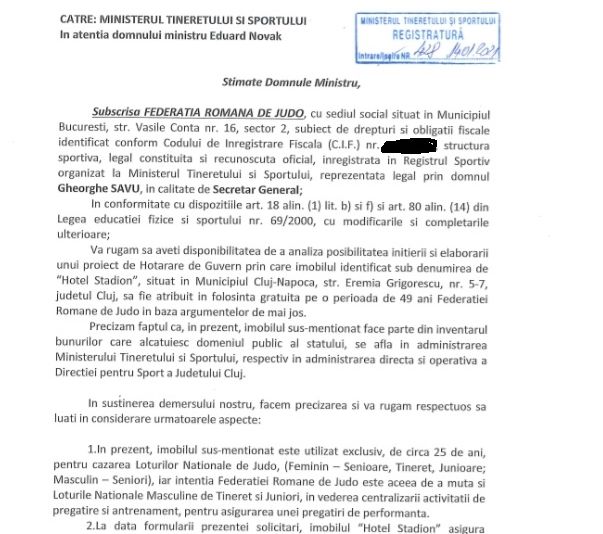 Ministrul Sportului, Eduard Novak, a înțeles, iată, că bazele sportive trebuie să revină la Federații. De decizia ministrului va beneficia și Federația Română de Judo, prin "Hotel Stadion", din municipiul Cluj-Napoca, așa cum reiese din adresele de mai jos: